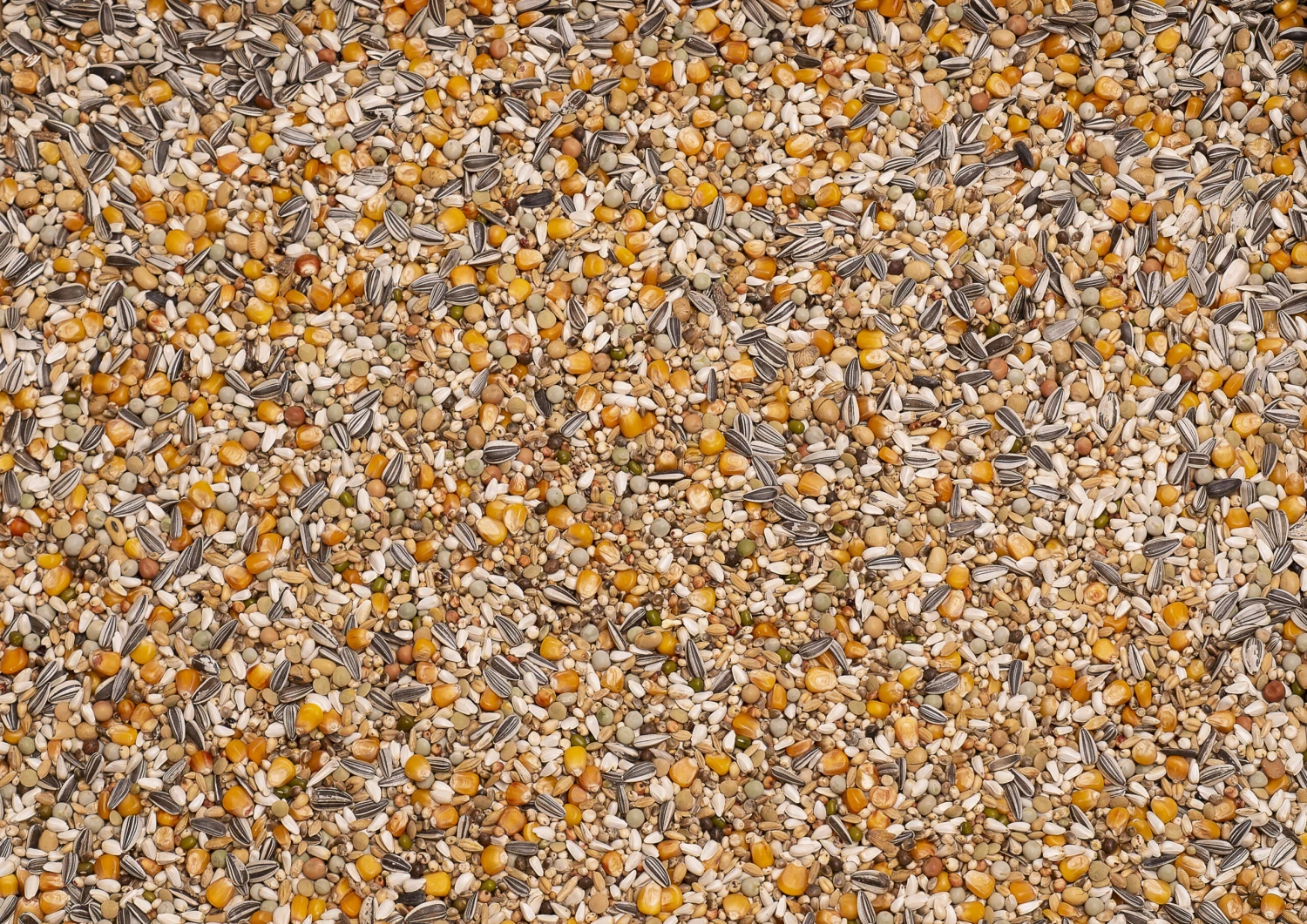 Weißer Dari 15%, kleiner Cribbs-Mais 12,5%, Cribbs-Mais 12,5%, Kardi 10%, Hanf 9%, kleine grüne Erbsen 9%, weißer Weizen 7%, roter Sorghum 3%, Paddy-Reis 3%, gelber Millet 2%, geschälter Hafer 2%, Katjang Idjoee 2%, gestreifte Sonnenblumenkerne 2%, getoastete Soja 2%, Wicken 2%, Linsen 2%, Dunpeas 1%, Gerste 1%, Sesam 1%, Kanariensaat 1%, Quinoa 1%
